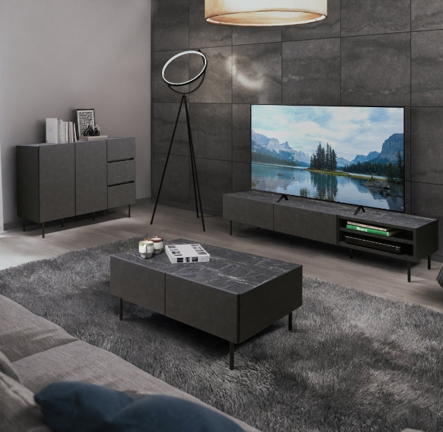 センターテーブルVI引出しとオープン棚の収納力が生活感をクローズドする、見せない美しさのためのセンターテーブル。床との間にすき間があることで、掃除機やお掃除ロボットが通りやすく、いつも清潔を保ちやすい設計です。日本製。