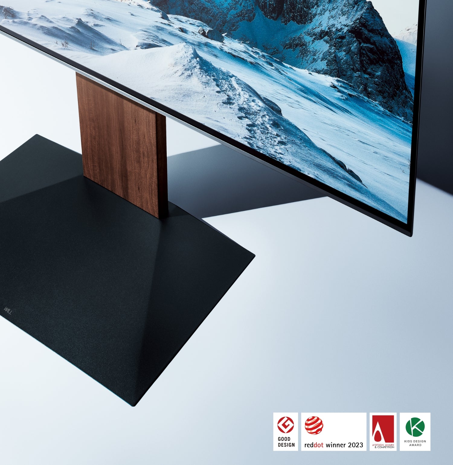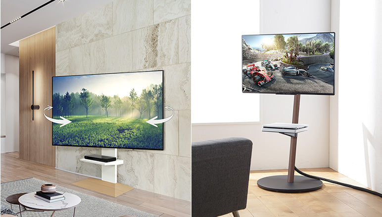 WALL INTERIOR TVSTAND V3・ V3 SWテレビ角度を調整し最適な位置で視聴可能。 特許取得の3Dベースは段差を感じさせず、小さなお子様やご年配の方、車椅子をご利用の方にも安心して設置できます。