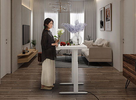 電動で簡単に上下できるだけでなく、無骨さのない丸みのあるフォルムのため、人が集うリビングに似合うスマートデスクです。