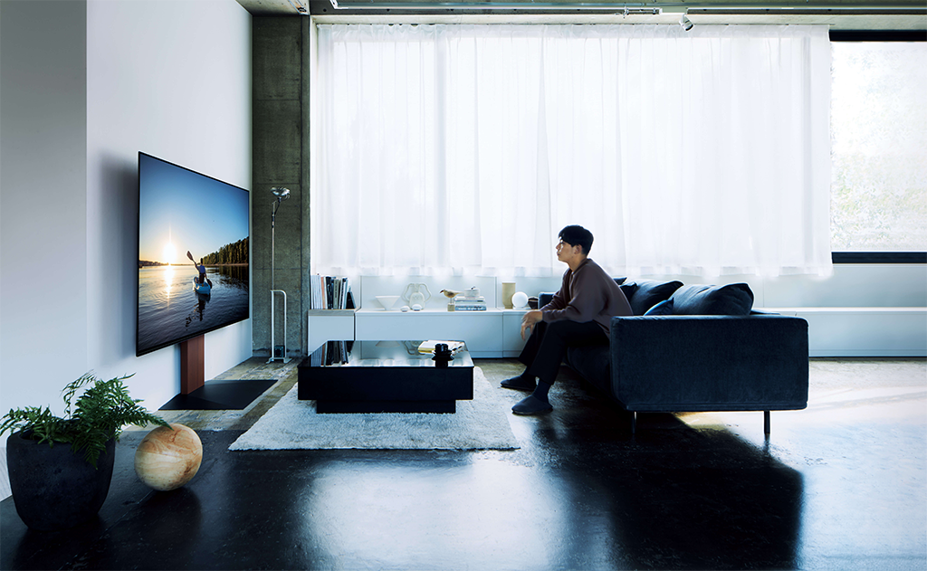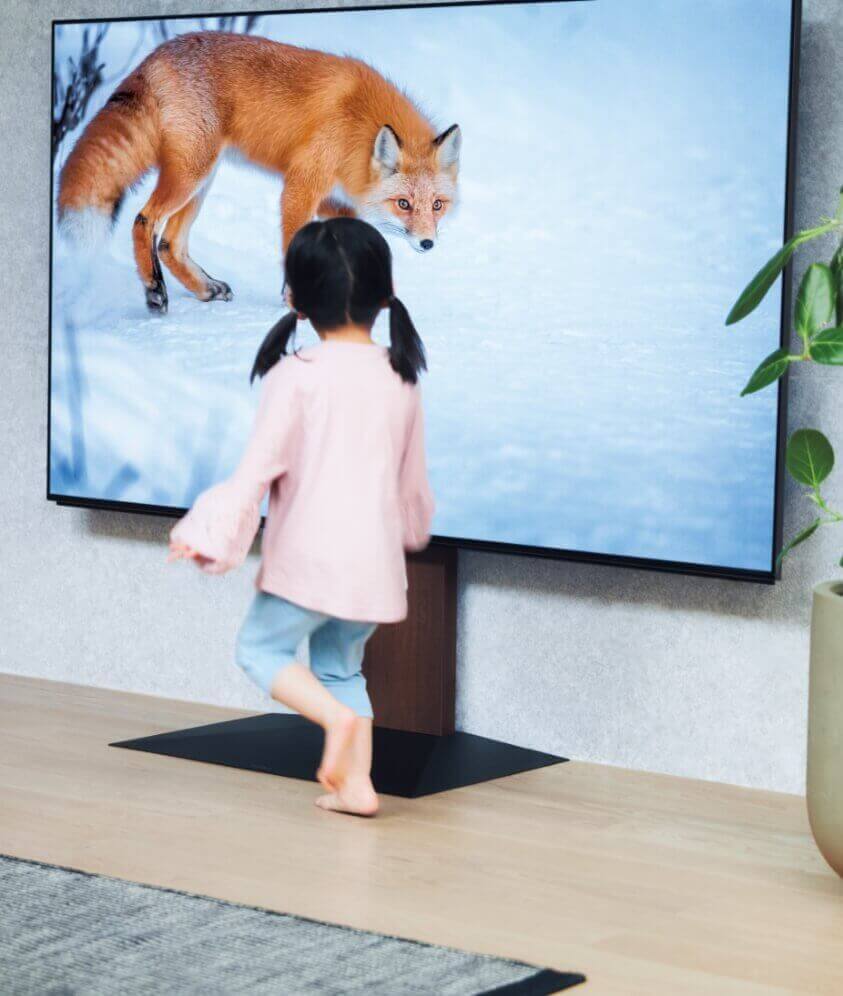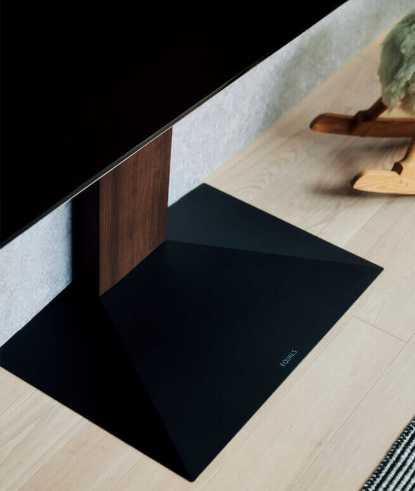 大型テレビを取り付けた際のバランスを計算してデザインされたベース・フロントパネルは、大型テレビに洗練された美しさと安心の安定感をもたらし、あらゆるインテリアと調和します。