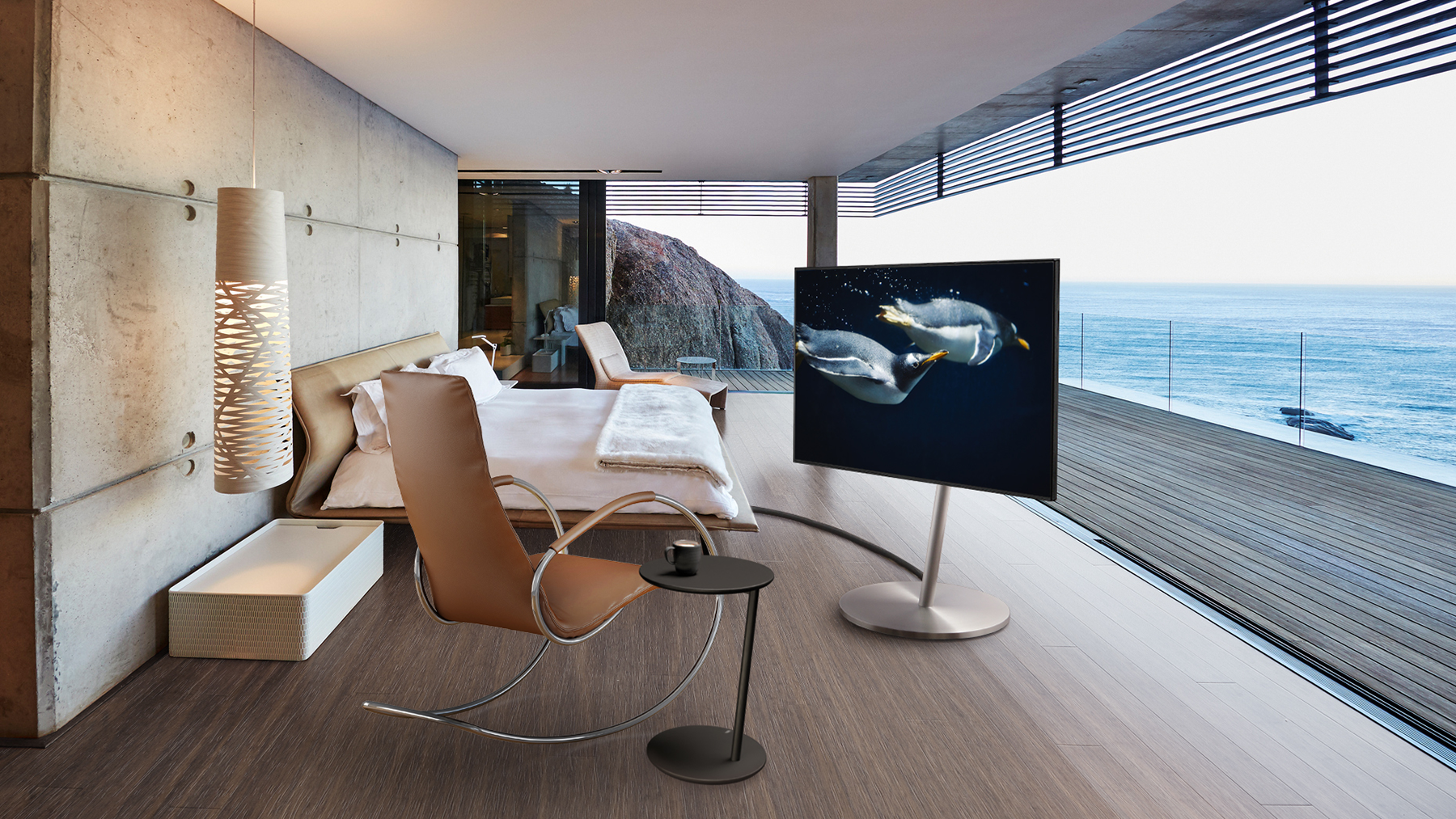 ベッド、ラウンジチェア、小さなサイドテーブル、そして精巧なステンレスの輝きが生み出す比類ない美しさ佇むテレビスタンド。