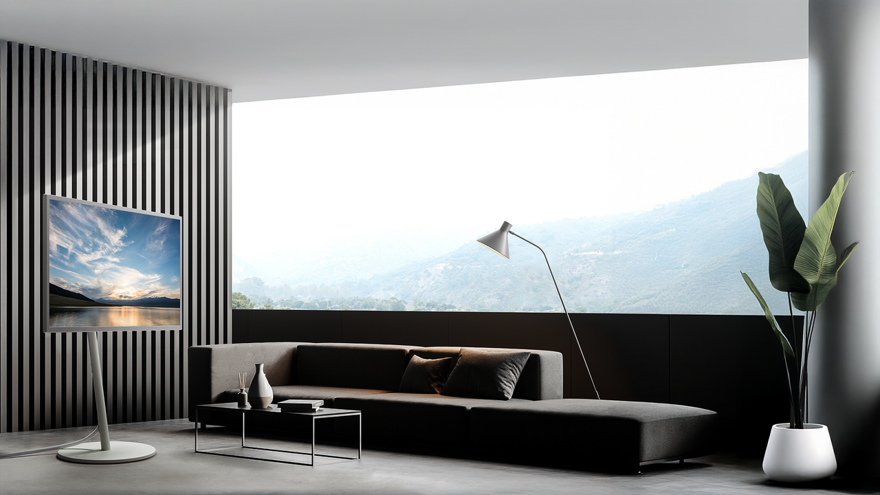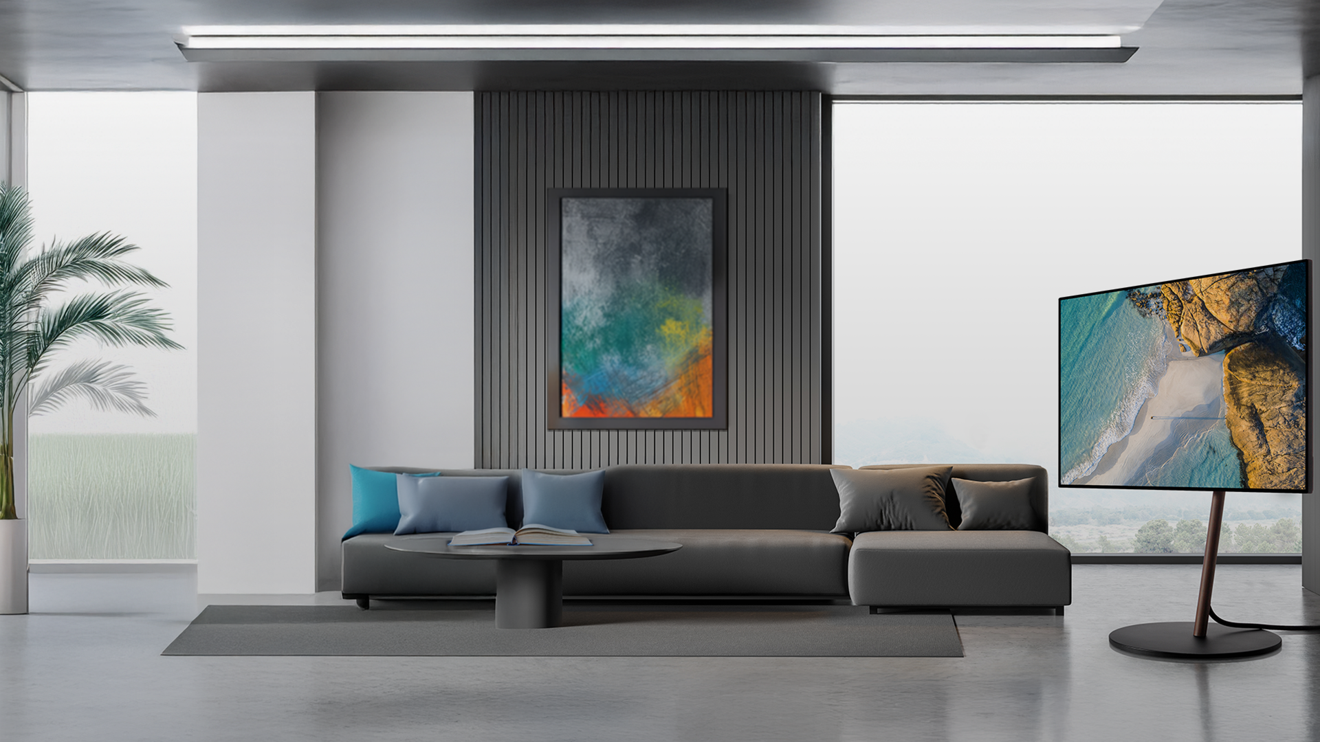 直線で構成された背景に、抽象的なアートを一点だけ添えることで、空間に緊張感と余白のバランスが生まれます。