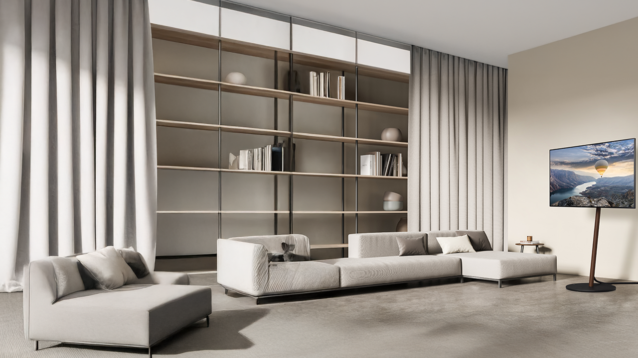 テレビは、あえて壁から距離を取れるようにテレビスタンドで自立させて、独立した存在として設えられています。
