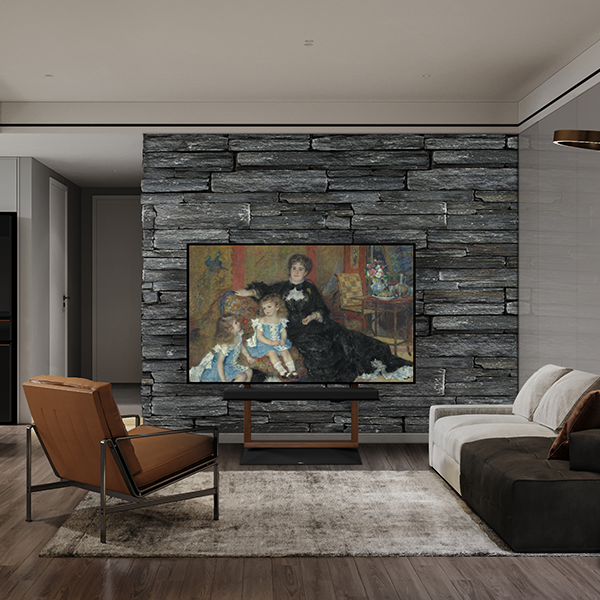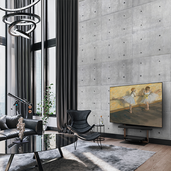 空間のリズムを整える存在です。映像を消しても、この部屋の完成度は揺らぎません。