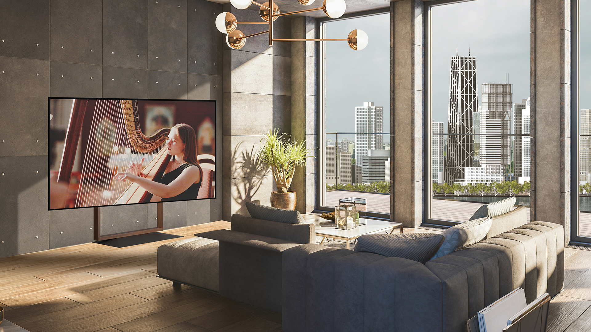 コンクリートの壁、伸びやかな天井高、そして大きく切り取られた窓の向こうに広がる都市の景色。