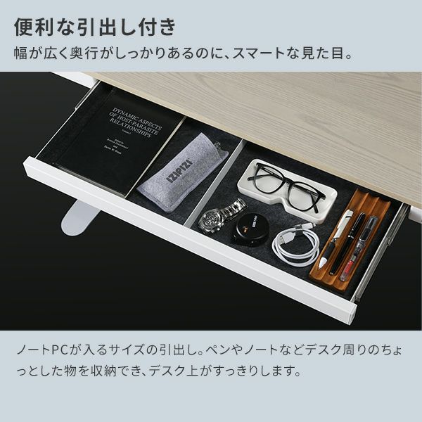 引出し付きで角も丸く優しいデザインのため、日々の暮らしの中心にも自然に溶け込みます。仕事や趣味に、場所を選ばず没頭できるデスクです。