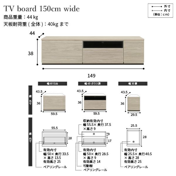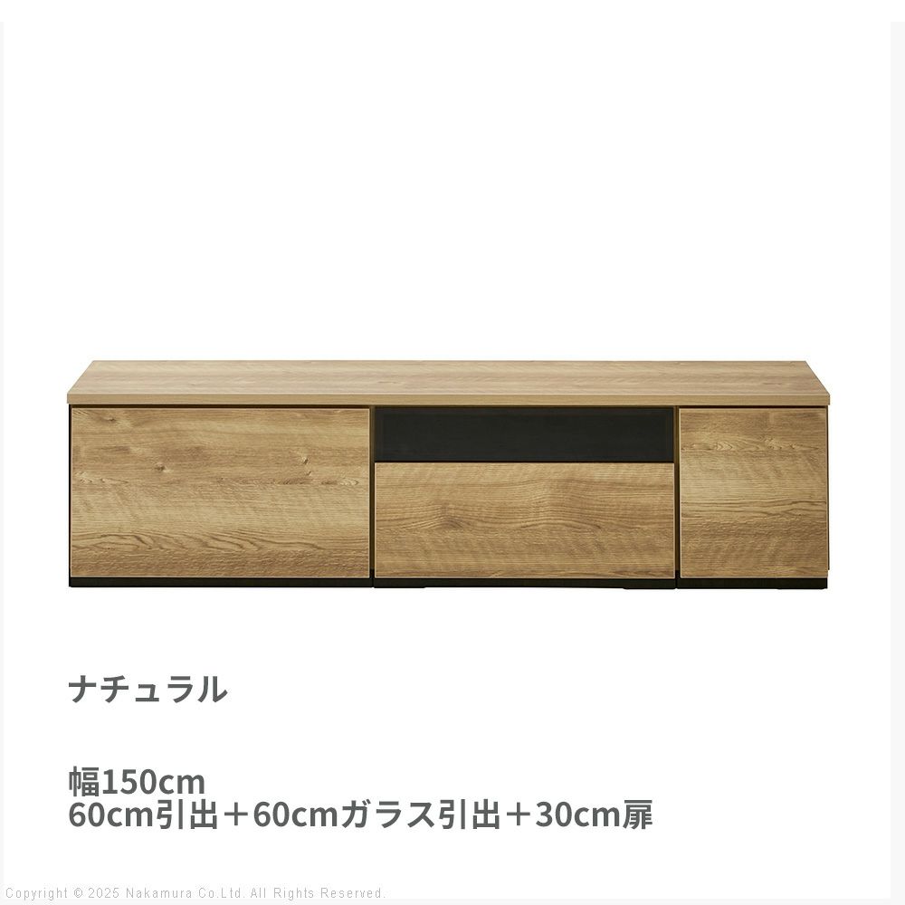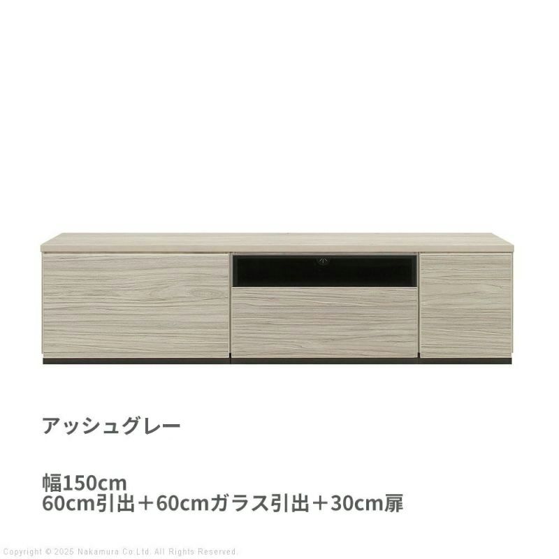 幅150cm: 60cm引出 + 60cmガラス引出 + 30cm扉