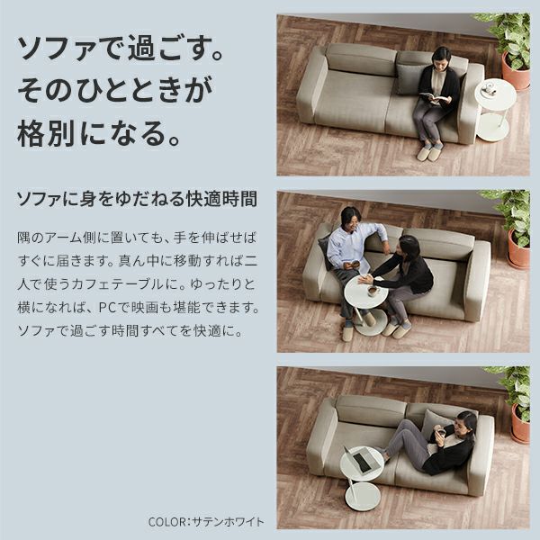 7の字フォルムで足元スペースにゆとりを確保し、ソファに干渉せず手元まで寄せられるサイドテーブル