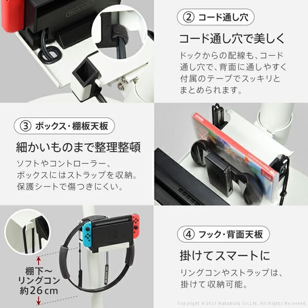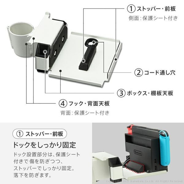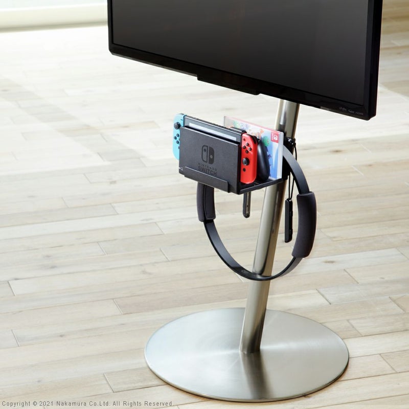 A2のスタイリッシュなデザインをそのままに、取り付け位置を「無段階調節」可能な、Nintendo Switch対応の棚板です。ドックを固定、付属のフックに周辺機器を掛けるなど、まとめやすいのでお部屋がすっきりします。