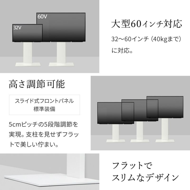 あるゆる空間で幅の広い視聴スタイルが楽しめるテレビスタンド。壁との一体化を意識し、正面からネジ穴が見えないシンプルなデザインのモデル。