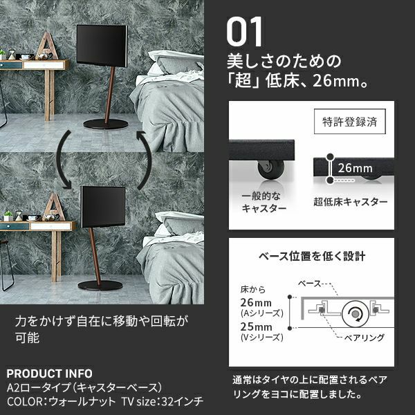 (1)キャスター付きテレビスタンド A2 LOWTYPE(サテンブラック)