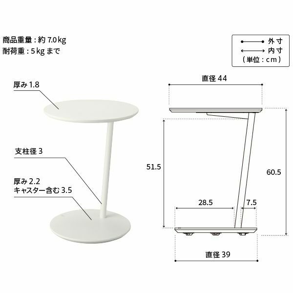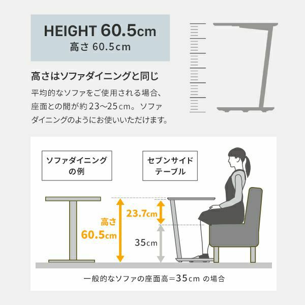 7の字フォルムで足元スペースにゆとりを確保し、ソファに干渉せず手元まで寄せられます。