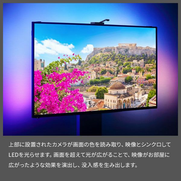 上部に設置されたカメラが画面の色を読み取り、映像とシンクロしてLEDを光らせます。