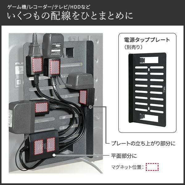 「電源タッププレート」をセットでお使いいただくことで、テレビの背面にコードをまとめることができ、足元の配線が最小限にできます。