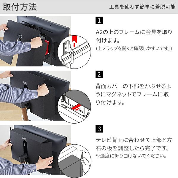 テレビ背面にセットした、HDDや機器のアダプターなどまるごとカバーで隠すことが可能に。どこに置いても、移動や回転をしても、美しさを保てます。