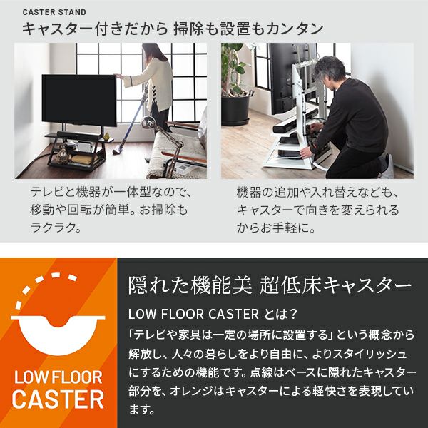 また、独自開発の超低床キャスターが付きなので、光の反射に合わせて角度を変えたり、少し横にずらしてお掃除をしたり、お部屋の使い方が自由になります。