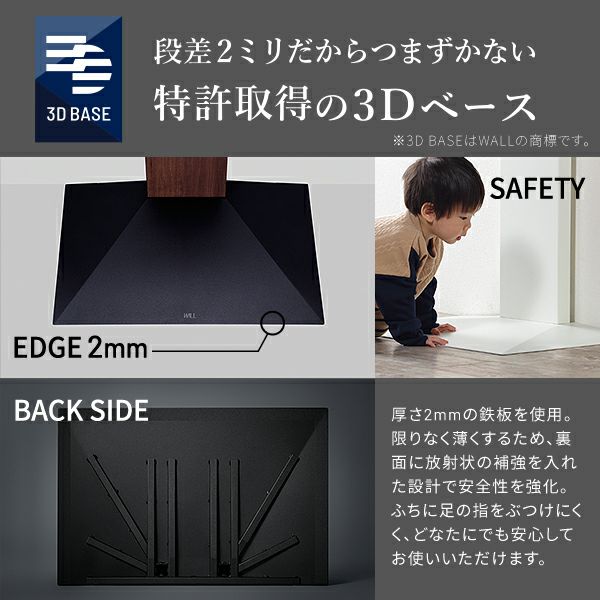 また、特許を取得した3Dベースが段差を感じさせないため、小さなお子様やご年配の方、車椅子をご利用の方の家にも安心して設置できる作りです。