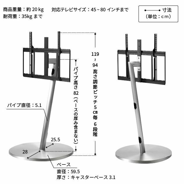 ステンレスの中でもグレードの高いSUS304を使用したSEVENSTANDのハイグレードモデル。 キャスターが目立たない薄型ベースで、ステンレスの重厚感と優美さを感じられます。