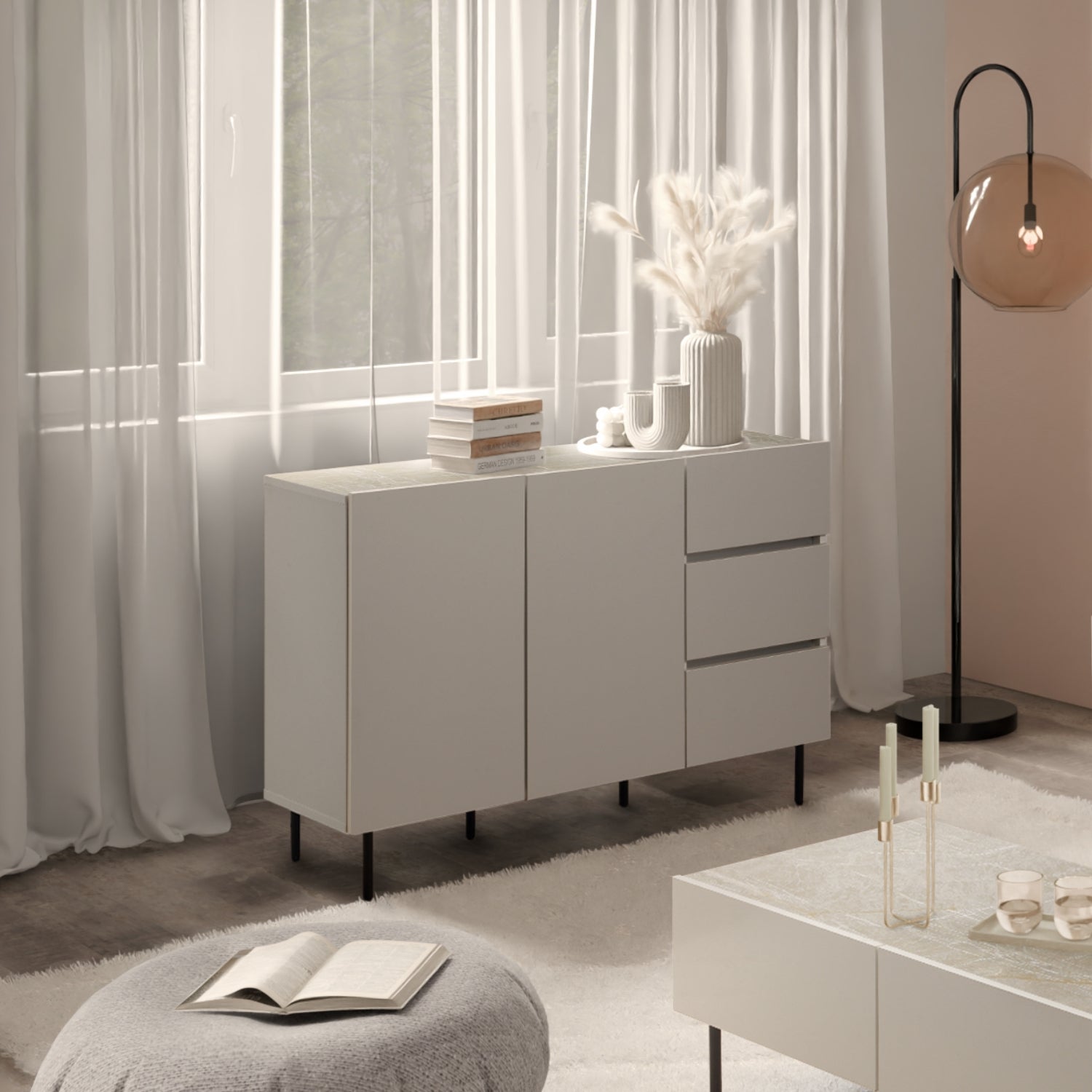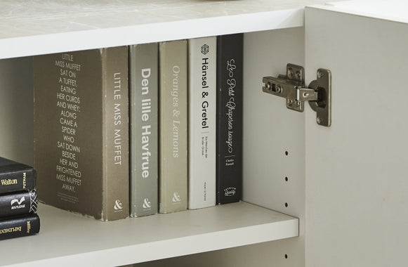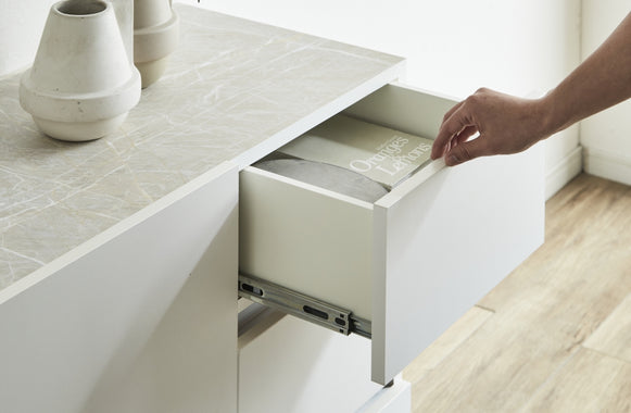 扉と引出しの大容量収納力が生活感をクローズドする、見せない美しさのためのキャビネット。