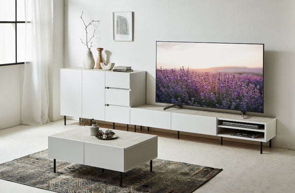石目調が圧迫感のない脚付きデザインのVI。テレビ台・キャビネット・センターテーブルのシリーズがあり、