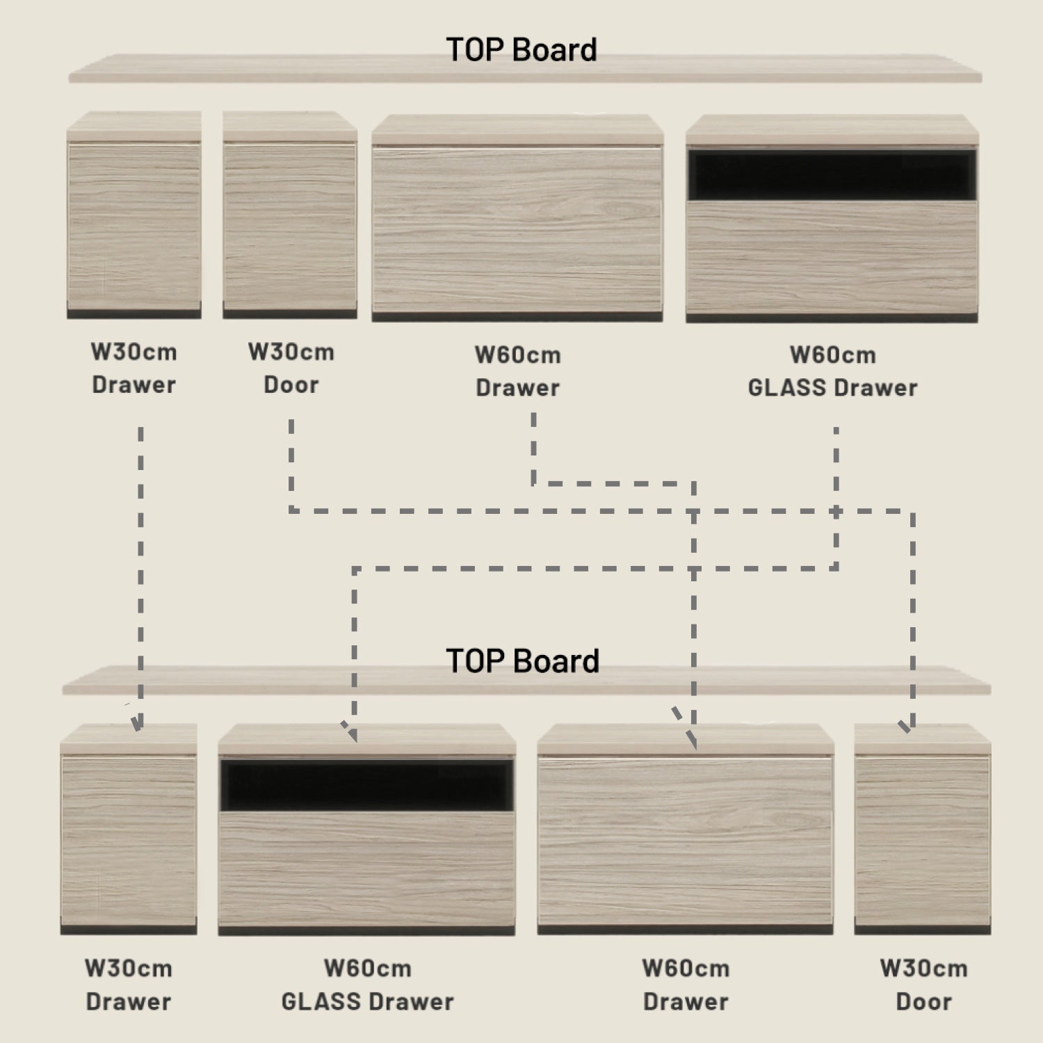 幅180cm: 30cm扉 + 60cm引出 + 60cmガラス引出 + 30cm引出