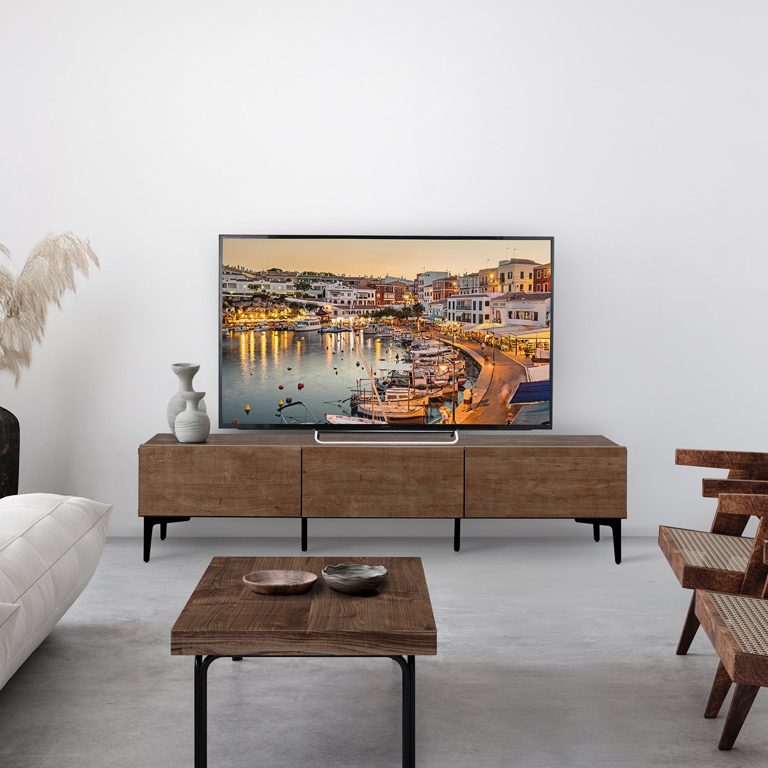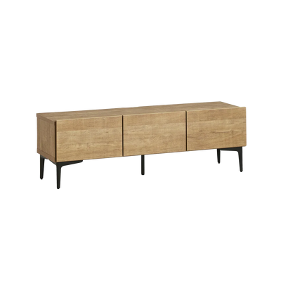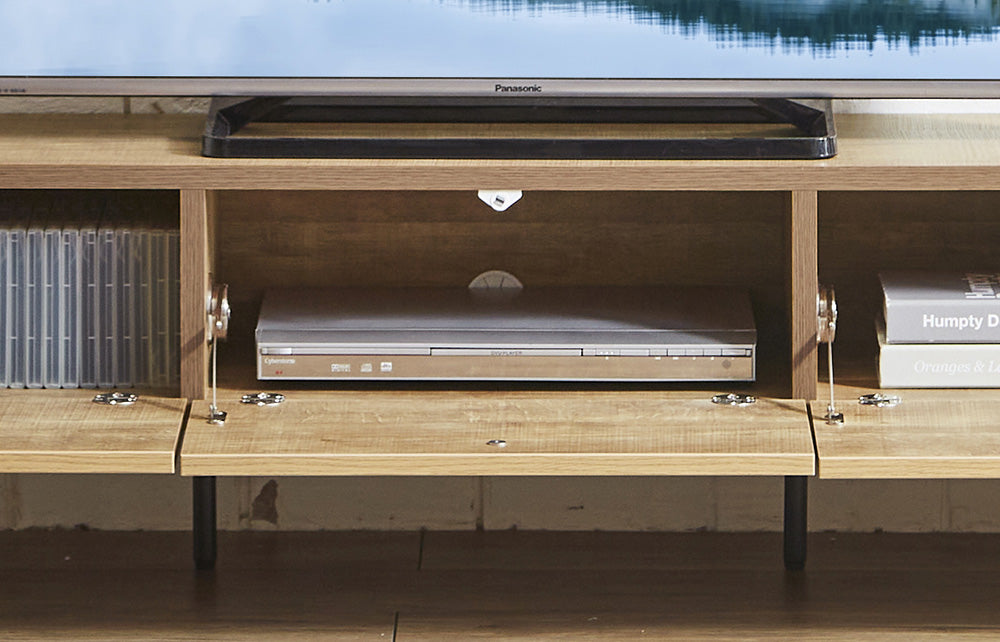 木目柄とスチールの組み合わせが印象的な脚付きテレビ台。