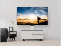 お部屋の壁紙に合わせてフロントパネルが白色、ベースをフローリングの色と合わせることで、床と壁に溶け込ませてテレビを壁掛け風に。